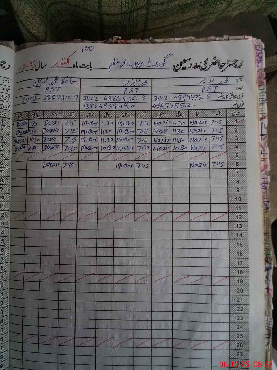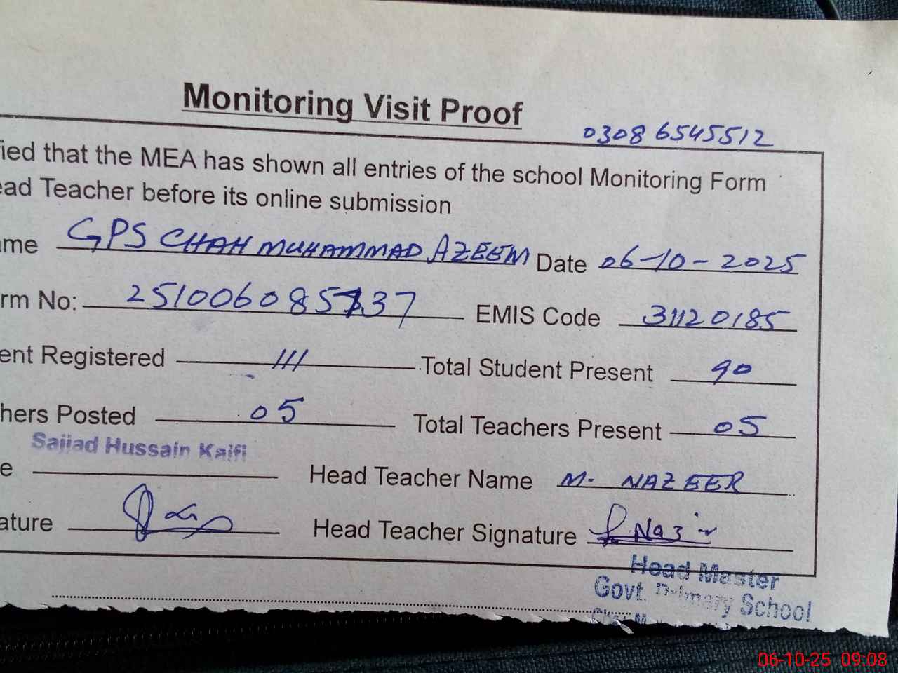 | Name: MU**** NA**** Designation: (School Headmaster's/Headmistress's) PST Phone/Cell Number: 03**** |