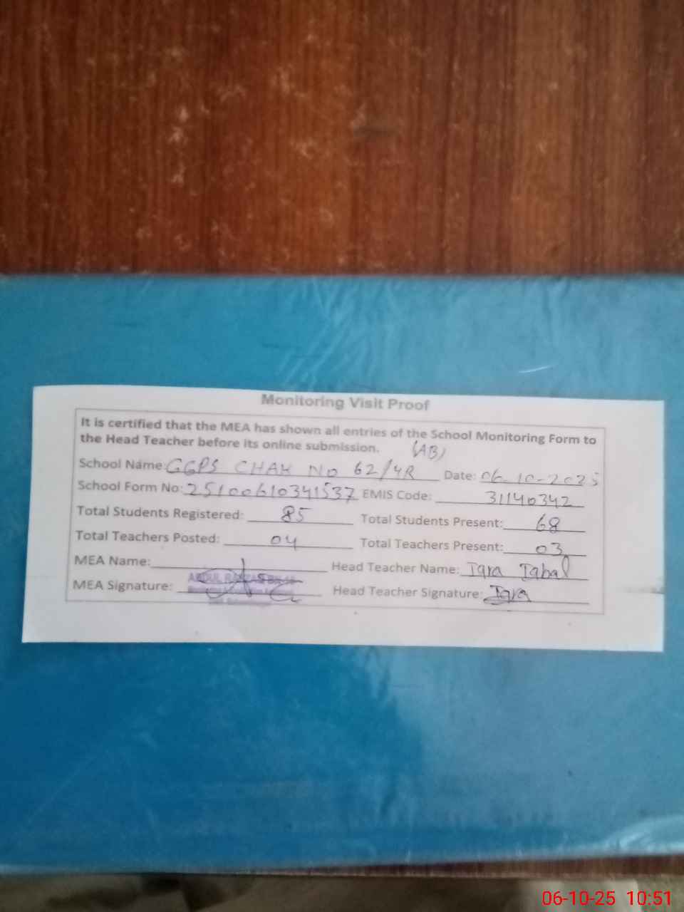 | EMIS Code: 31140342 | Name of School: GGPS CHAK 62/4-R AB | |||