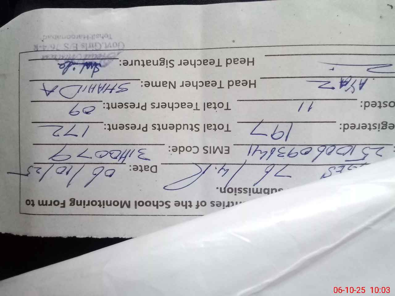 | Name: Za**** Ko**** Designation: (School Headmaster's/Headmistress's) SST Phone/Cell Number: 03**** |