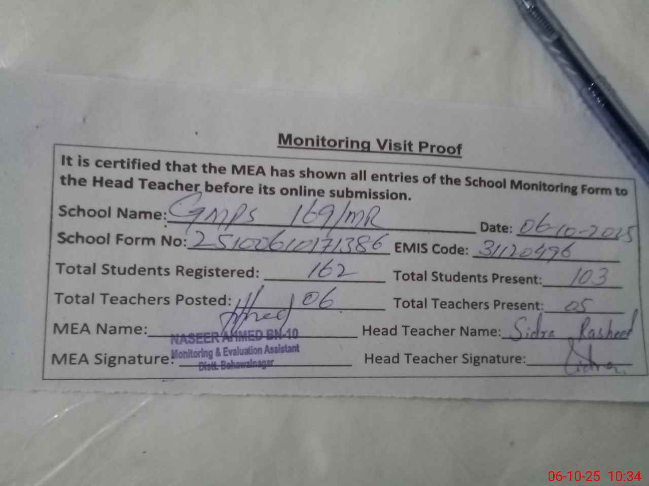 | EMIS Code: 31120496 | Name of School: GMPS CHAK NO. 169/M (A) | |||