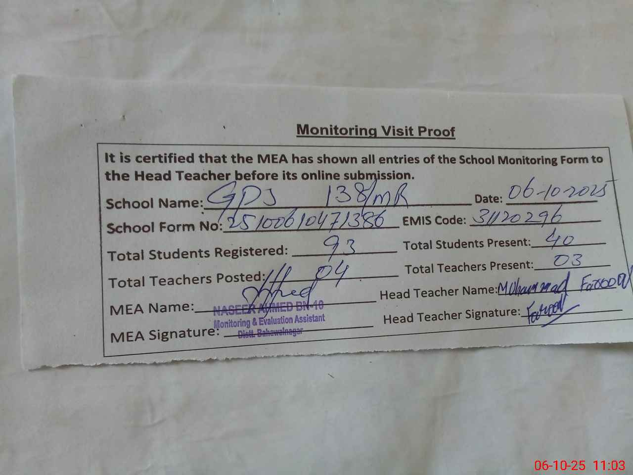 | EMIS Code: 31120296 | Name of School: GPS CHAK NO 138 M | |||