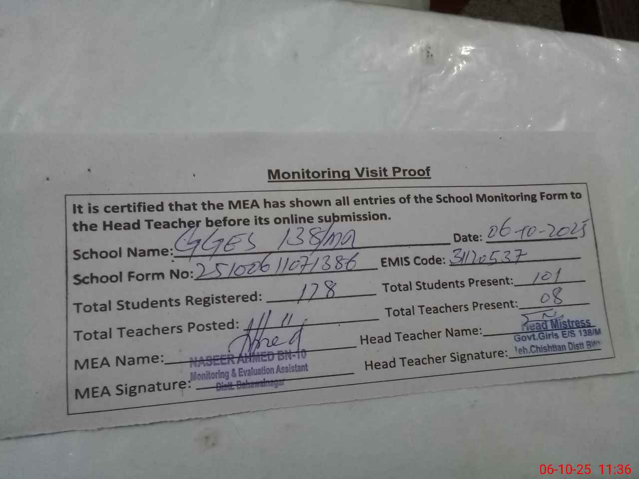 | EMIS Code: 31120537 | Name of School: GGES CHAK NO. 138 MURAD | |||