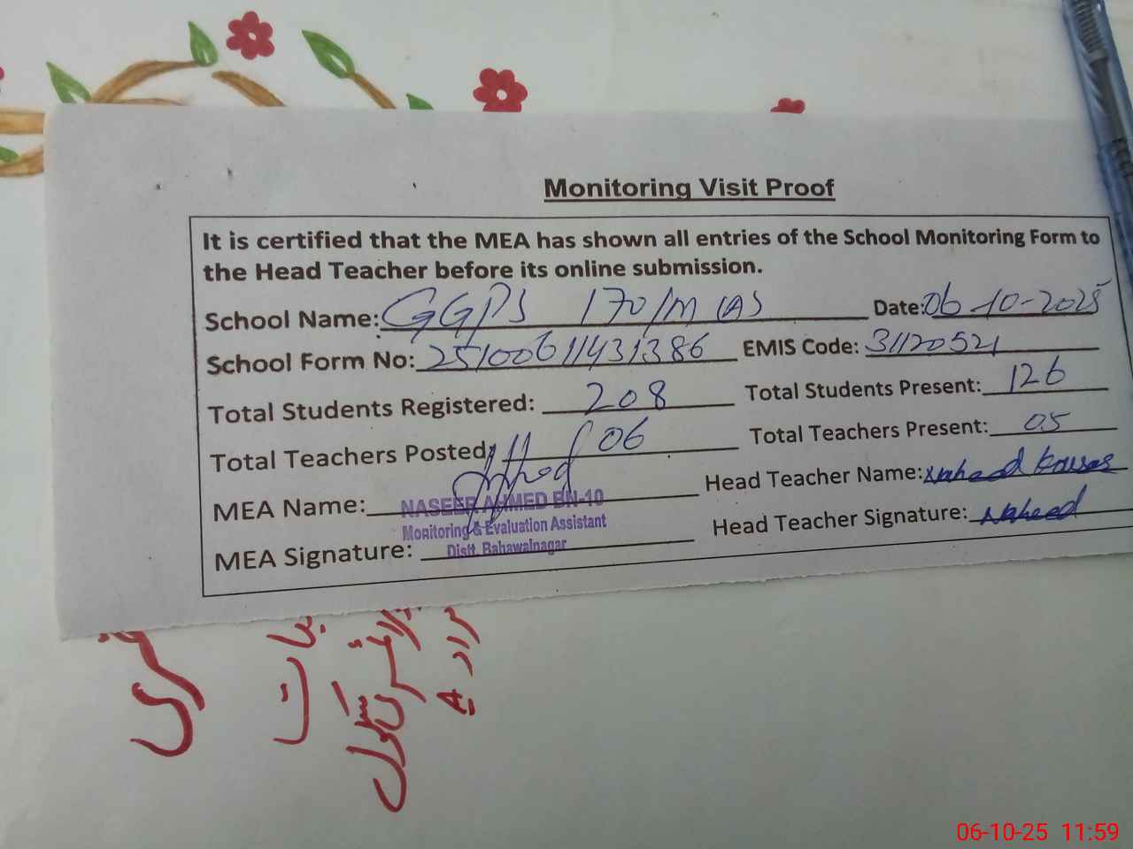 | EMIS Code: 31120521 | Name of School: GGPS CHAK NO 170/M (A) | |||