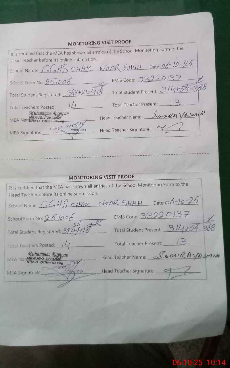 | EMIS Code: 33220137 | Name of School: GGHS CHAK NOOR SHAH | |||