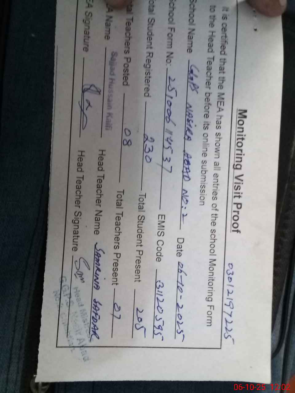 | Attendance Register | Head Teacher | MEA with School | Visit Proof |