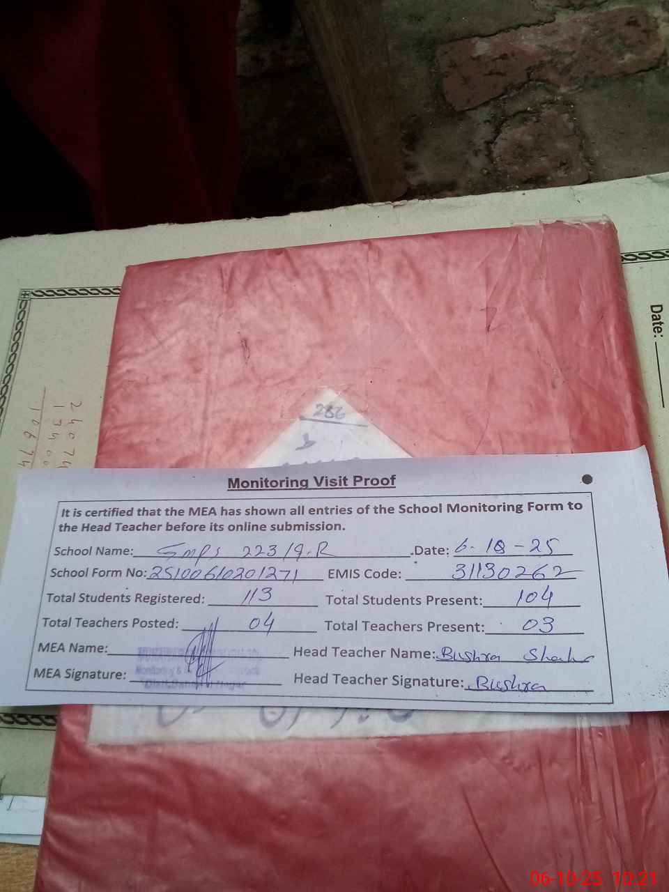 | Attendance Register | Head Teacher | MEA with School | Visit Proof |