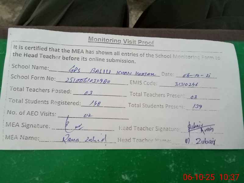 | EMIS Code: 31310246 | Name of School: GPS BALIU KHAN KHATAK (After Noon) | |||