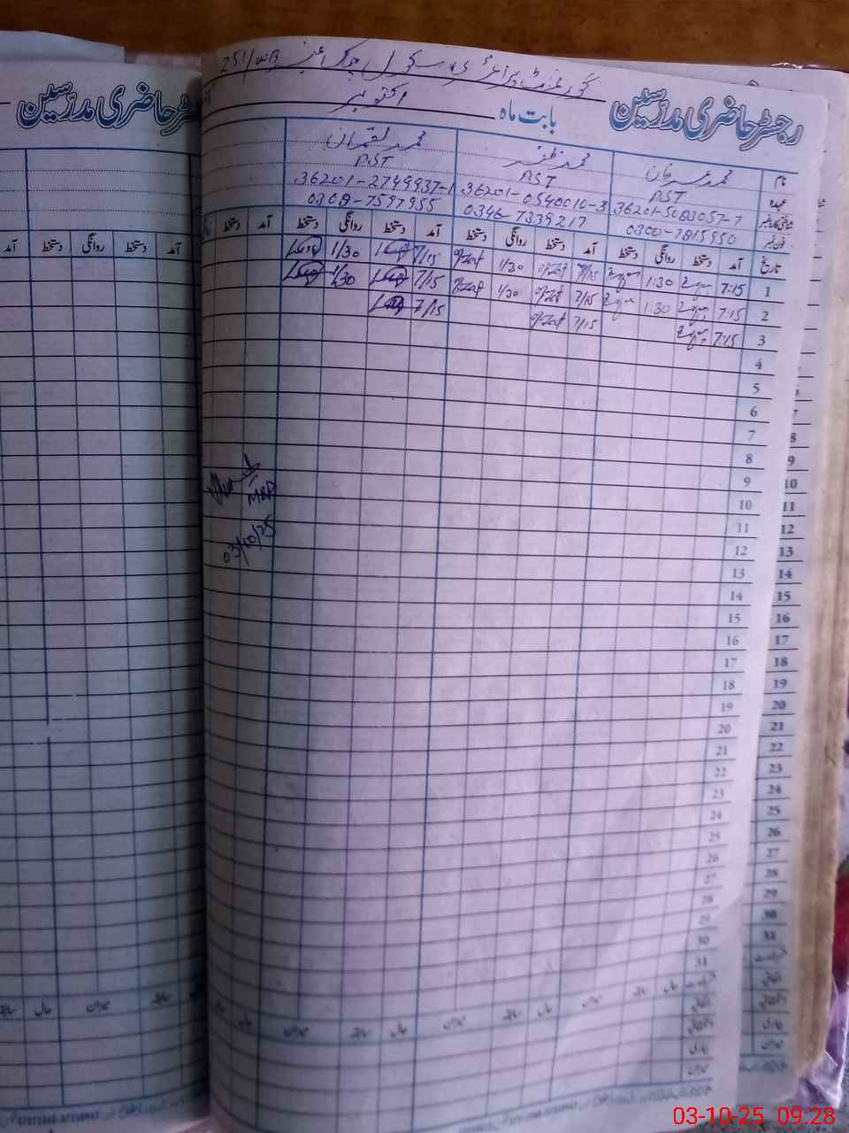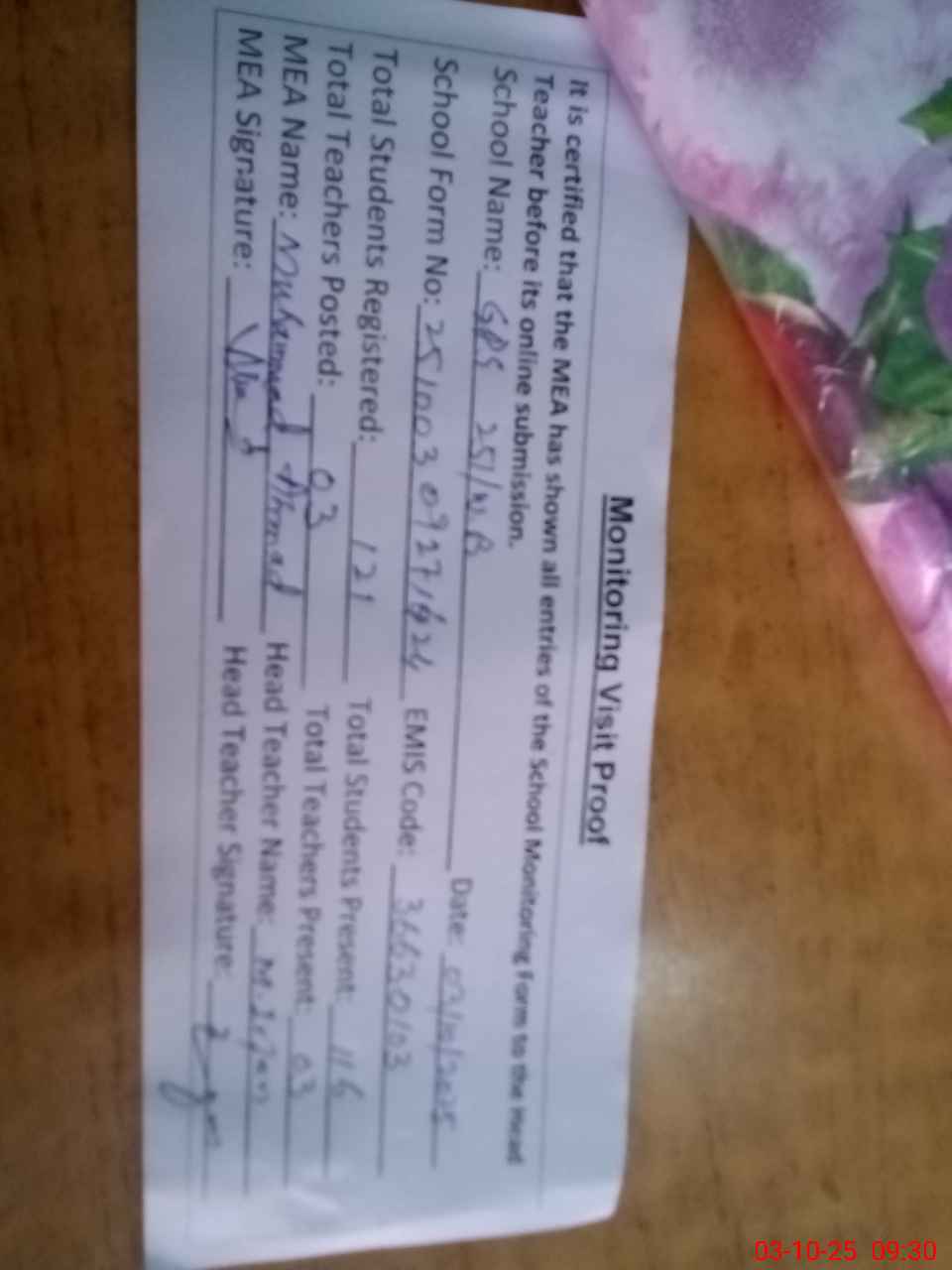 | Name: MU**** IR**** Designation: (School Headmaster's/Headmistress's) PTC/JV Phone/Cell Number: 03**** |