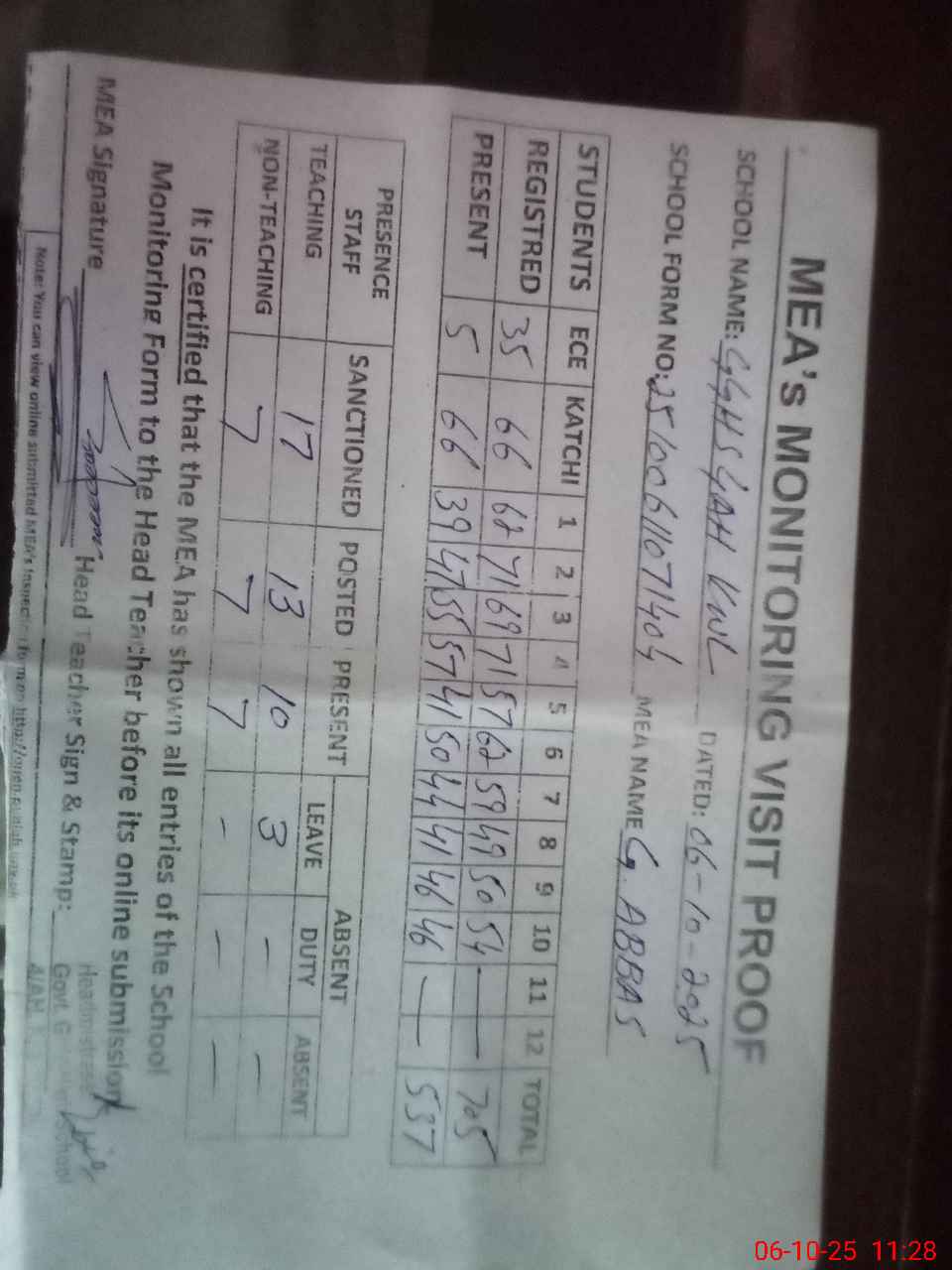 | Certified that this School was Inspected by the Undersigned MEA/DMO Today and the Information Stated Above is as Per Record. | |||||