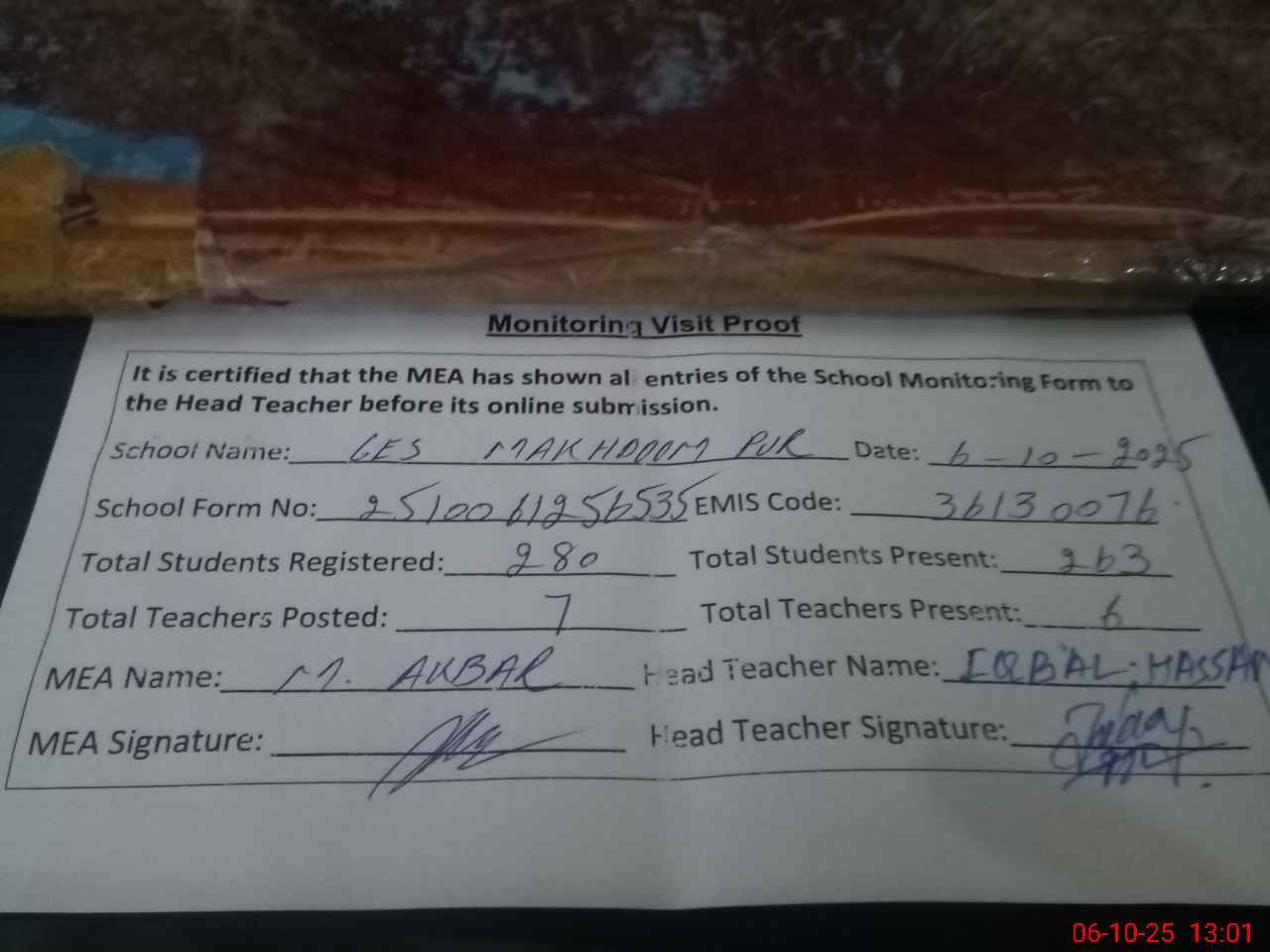 | Attendance Register | Head Teacher | MEA with School | Visit Proof |