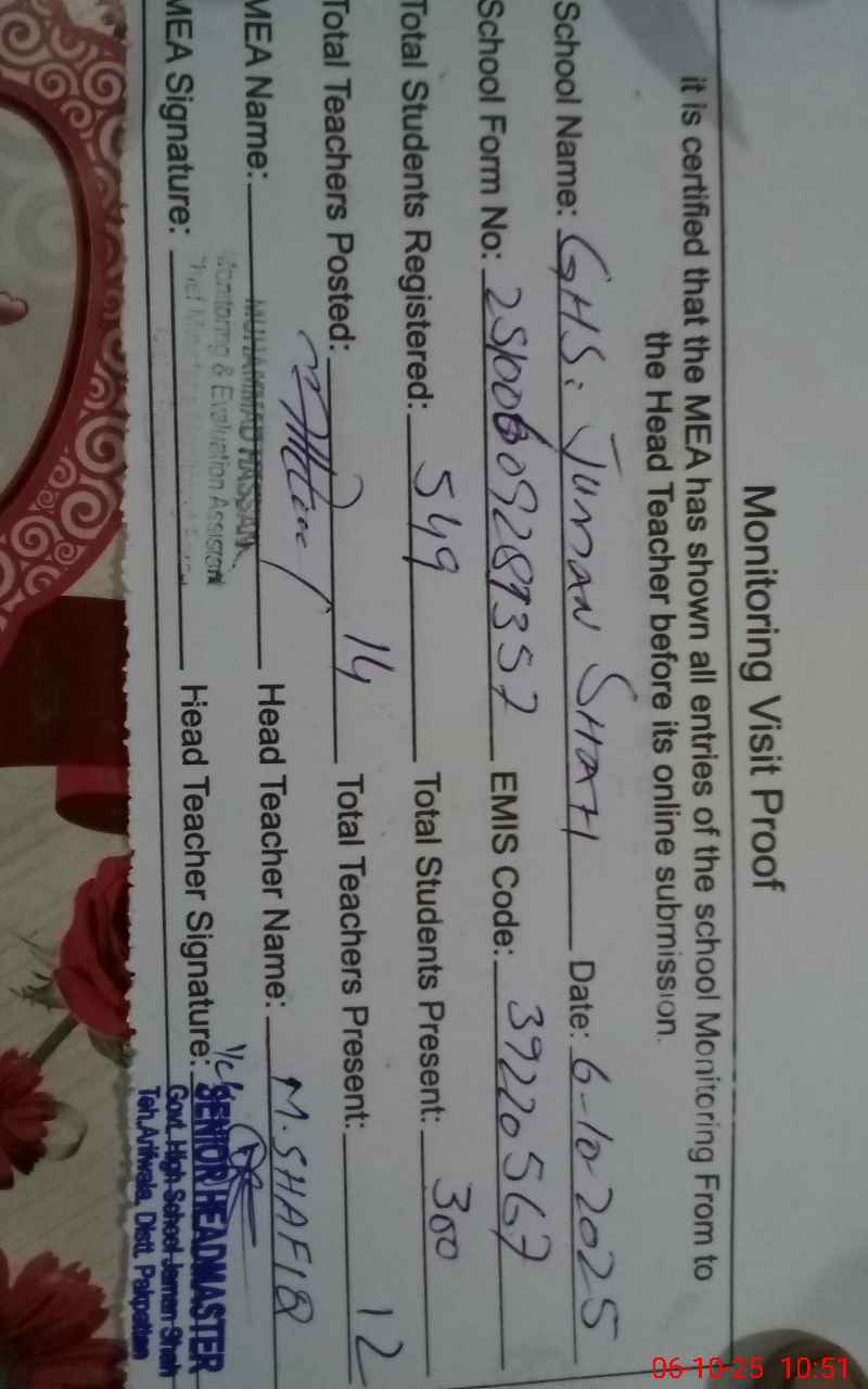 | EMIS Code: 39220567 | Name of School: GHS JUMAN SHAH | |||