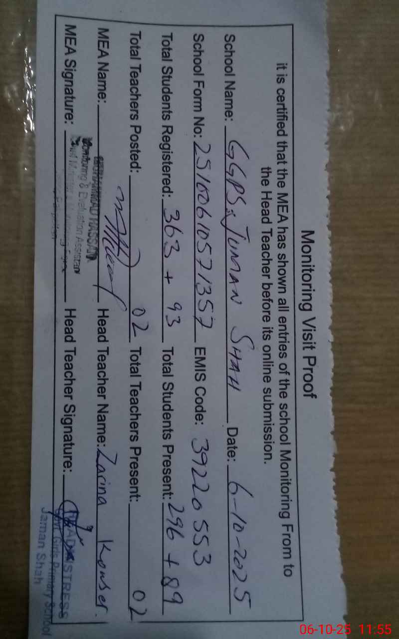 | EMIS Code: 39220553 | Name of School: GGPS JAMAN SHAH | |||