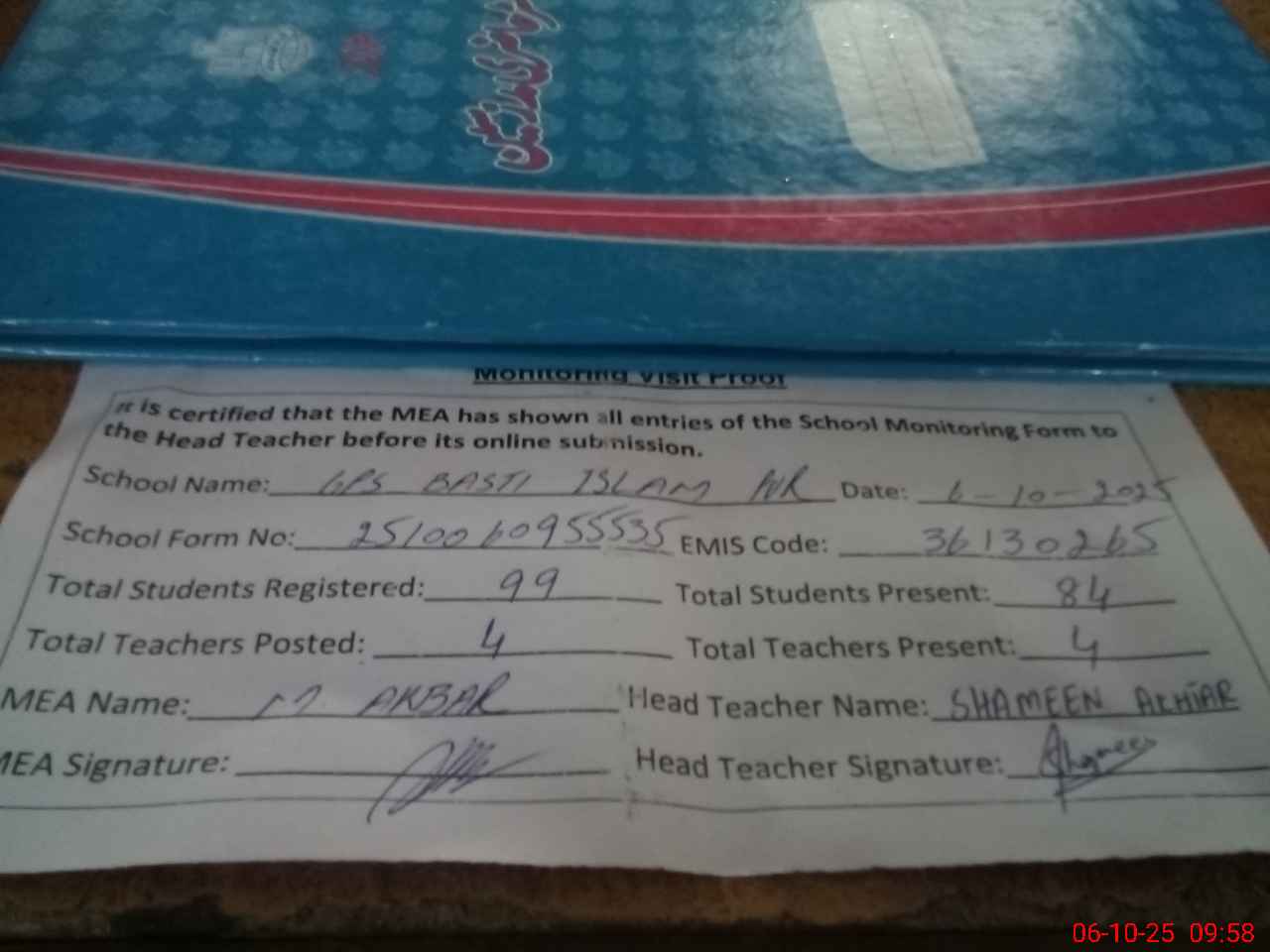 | Attendance Register | Head Teacher | MEA with School | Visit Proof |