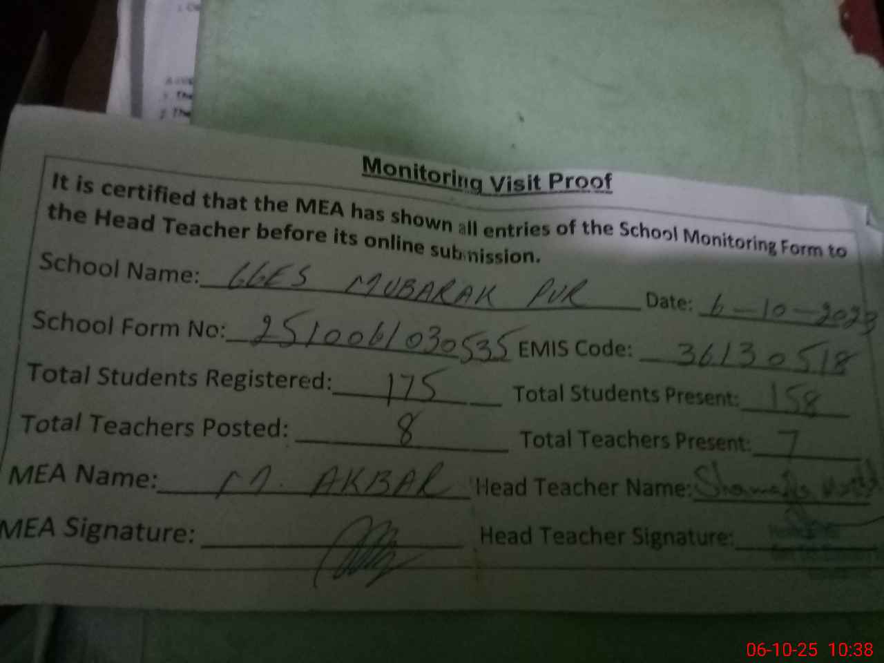 | EMIS Code: 36130518 | Name of School: GGES MUBARAK PUR | |||