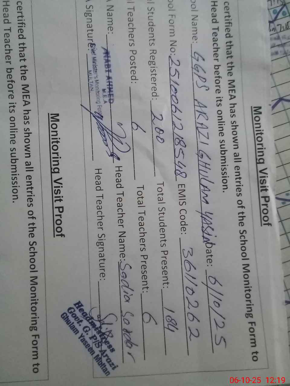 | EMIS Code: 36110262 | Name of School: GGPS ARAZI GHULAM YASIN DUNYA PUR ROAD MULTAN | |||