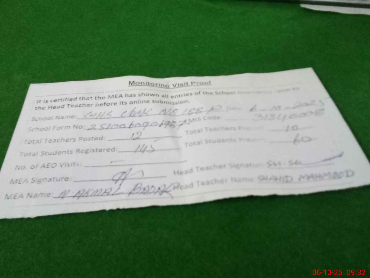 | Monitoring Date: 06-10-2025 | Start Time: 06-10-2025 09:06 AM | End Time: 06-10-2025 09:47 AM | Name of MEA: Mu**** Ak**** Ba**** | |