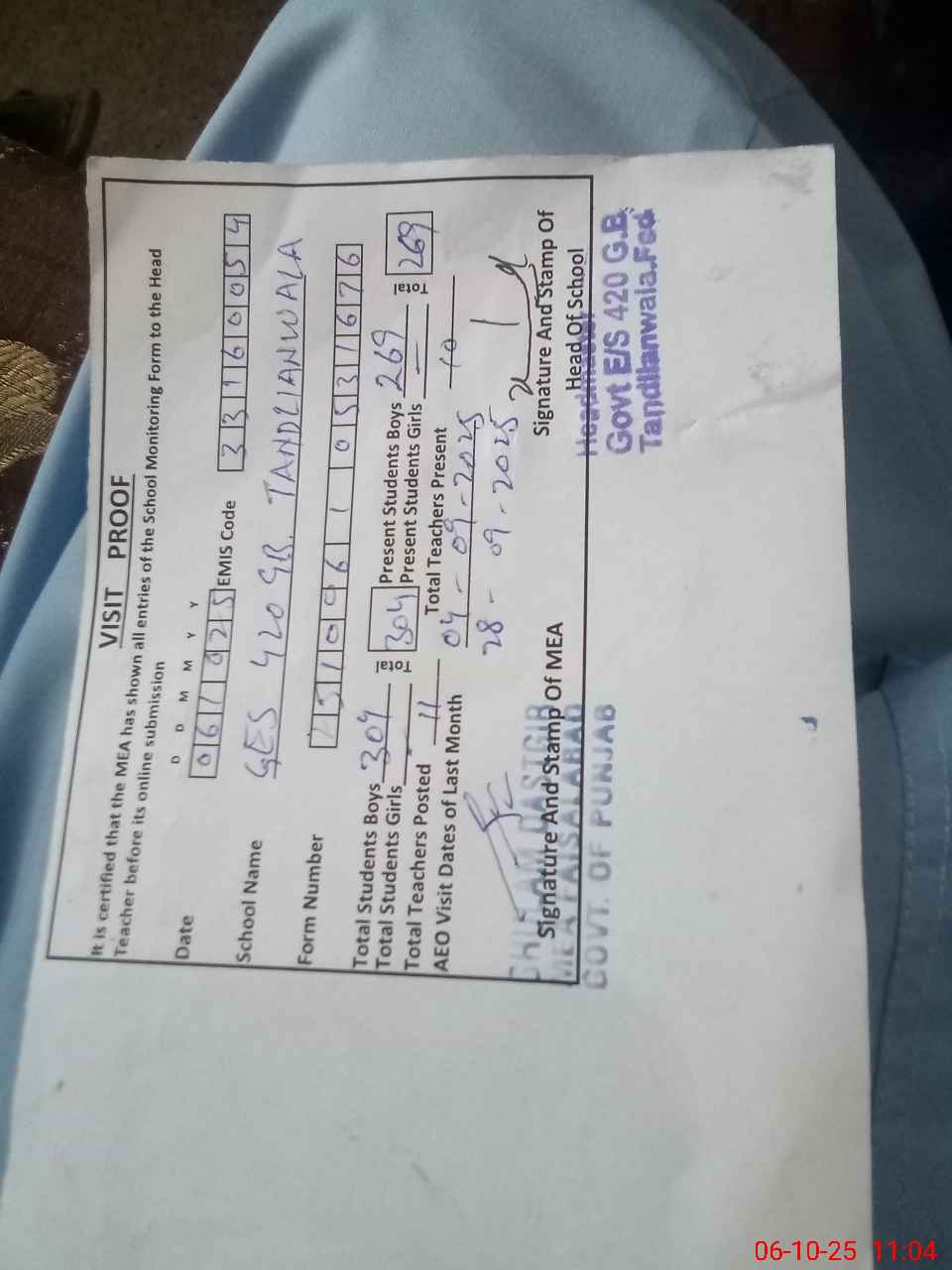 | Attendance Register | Head Teacher | MEA with School | Visit Proof |