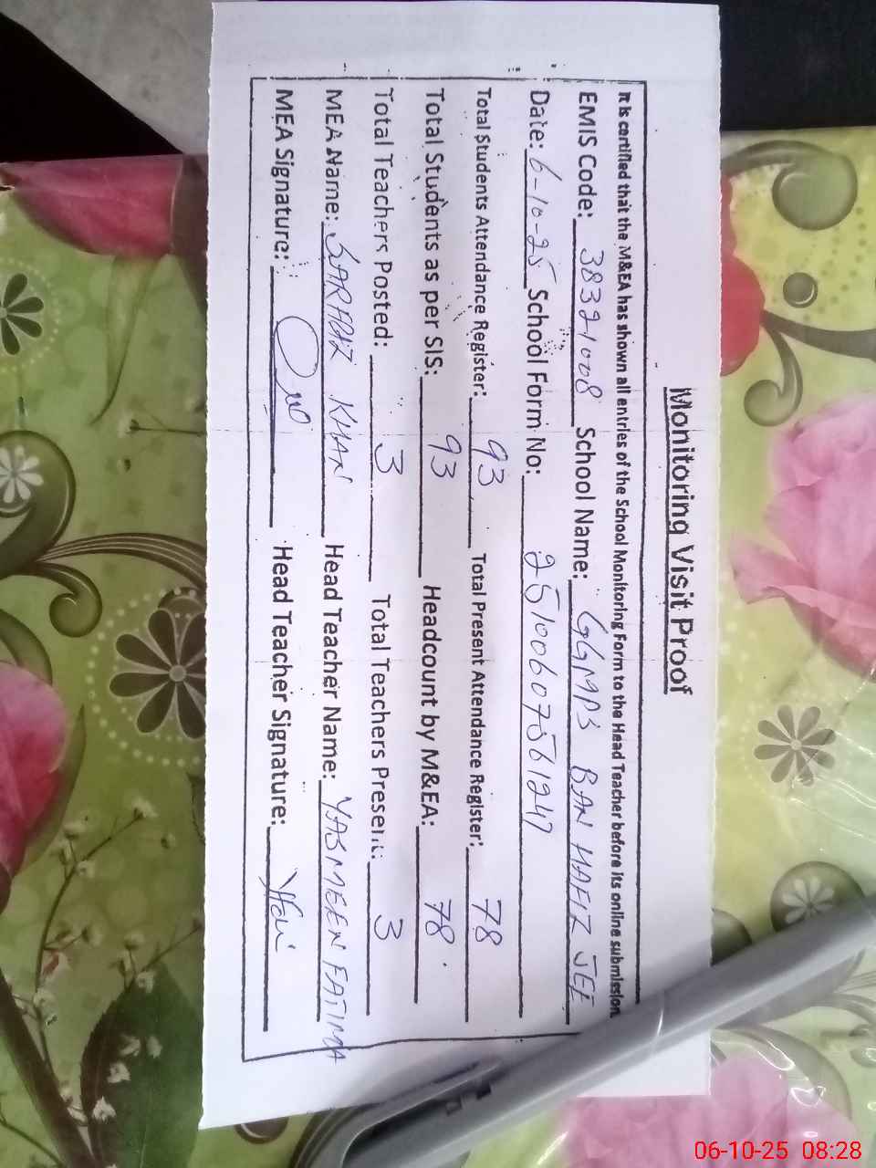 | Attendance Register | Head Teacher | MEA with School | Visit Proof |