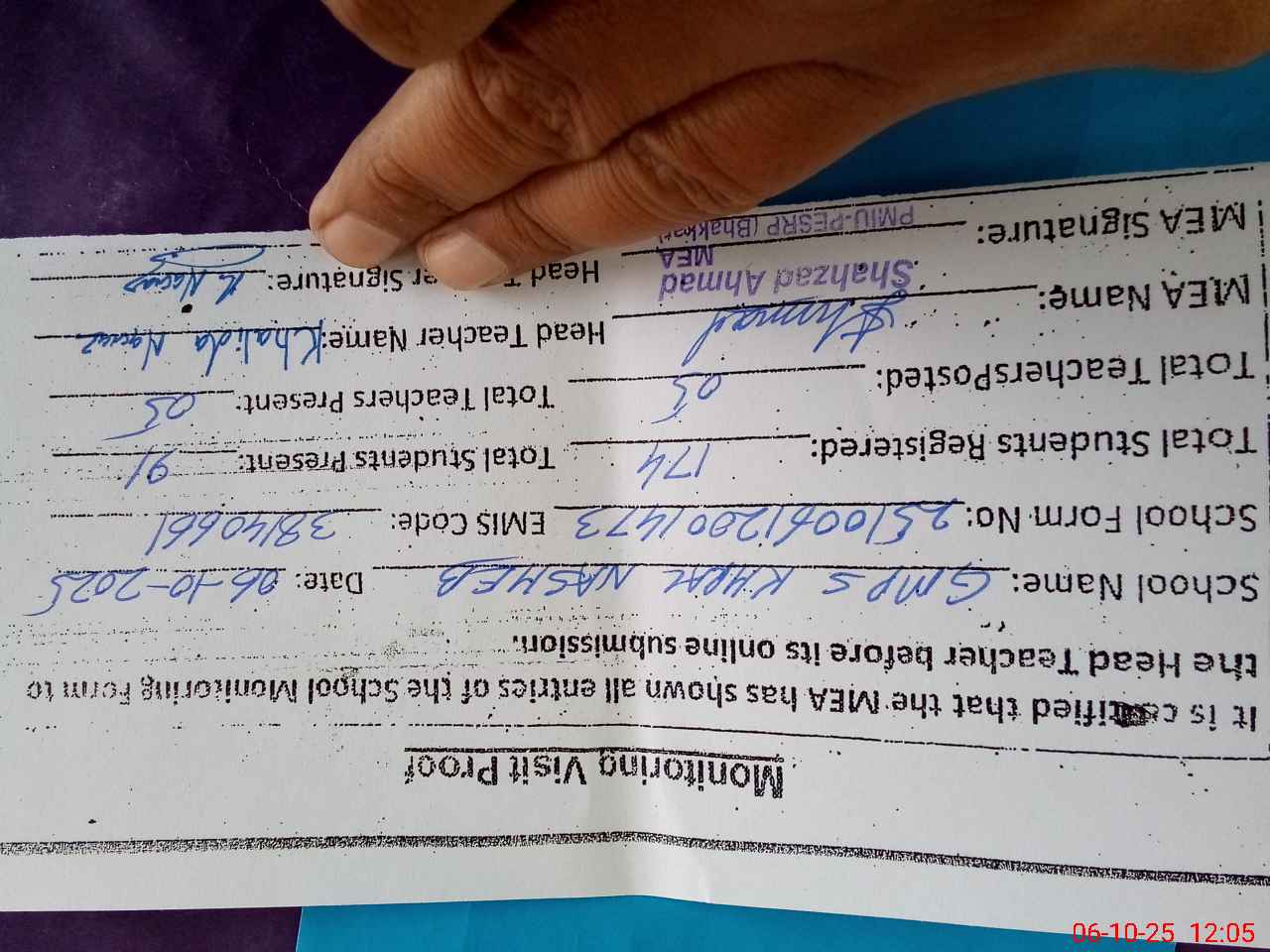 | Name: KH**** NA**** Designation: (School Headmaster's/Headmistress's) PTC/JV Phone/Cell Number: 03**** |