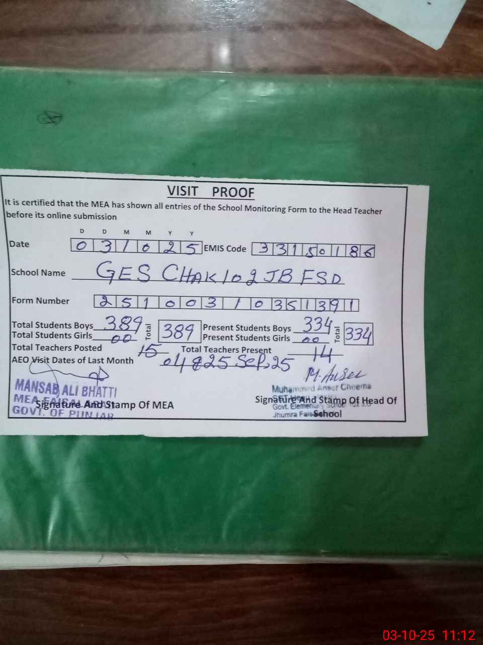 | Certified that this School was Inspected by the Undersigned MEA/DMO Today and the Information Stated Above is as Per Record. | |||||