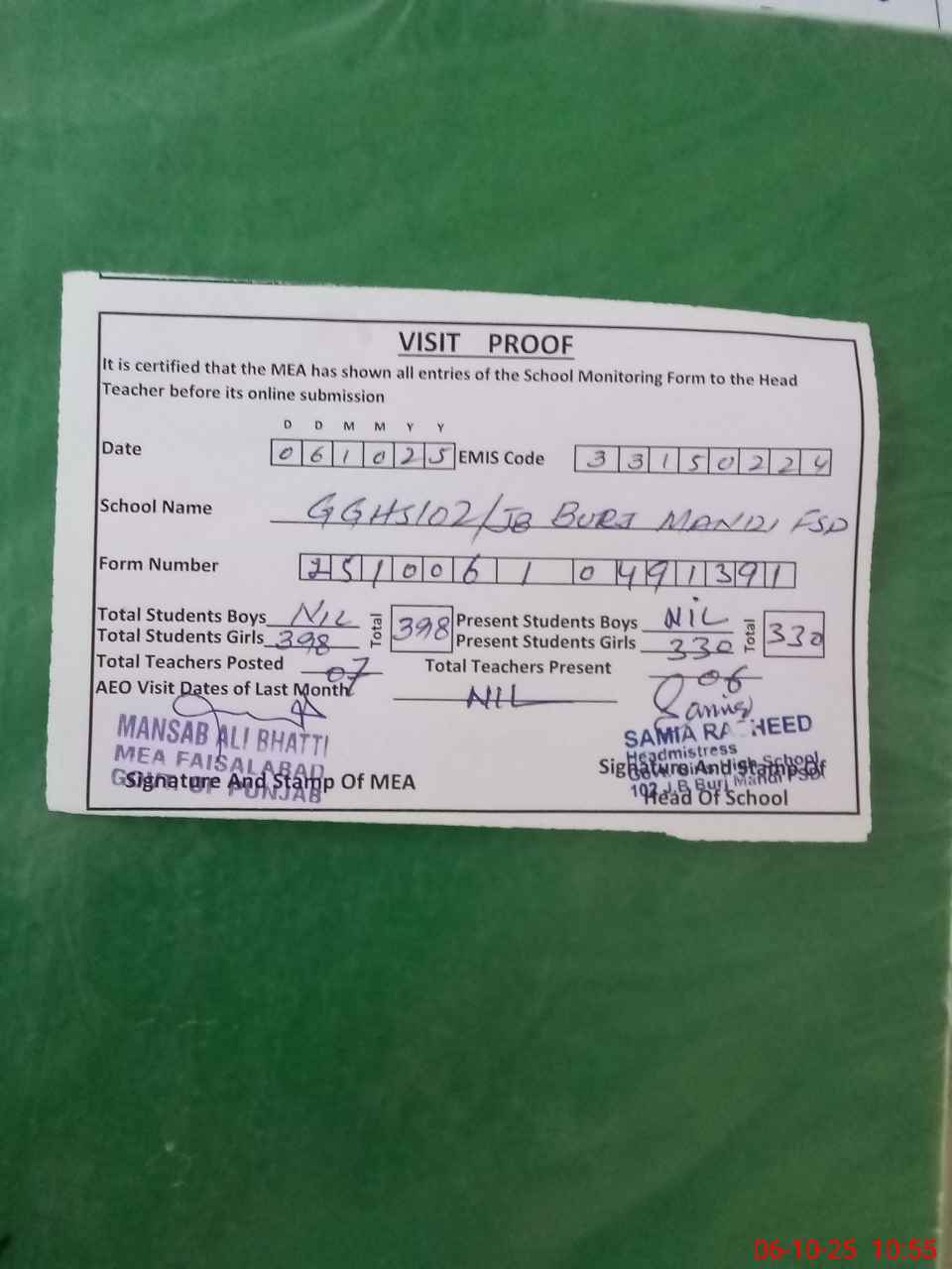 | Certified that this School was Inspected by the Undersigned MEA/DMO Today and the Information Stated Above is as Per Record. | |||||