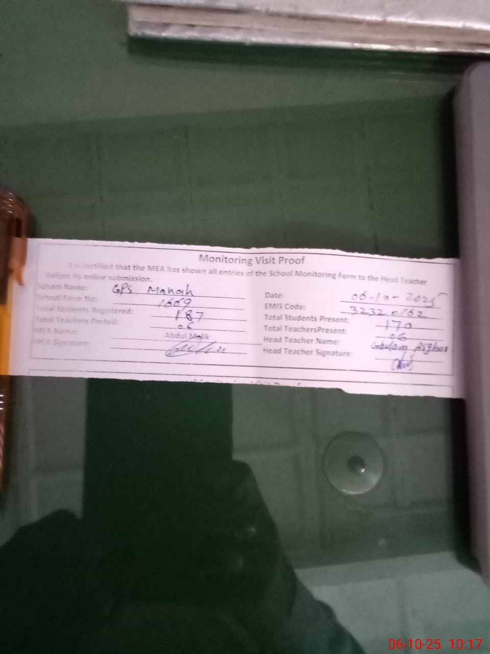 | Attendance Register | Head Teacher | MEA with School | Visit Proof |