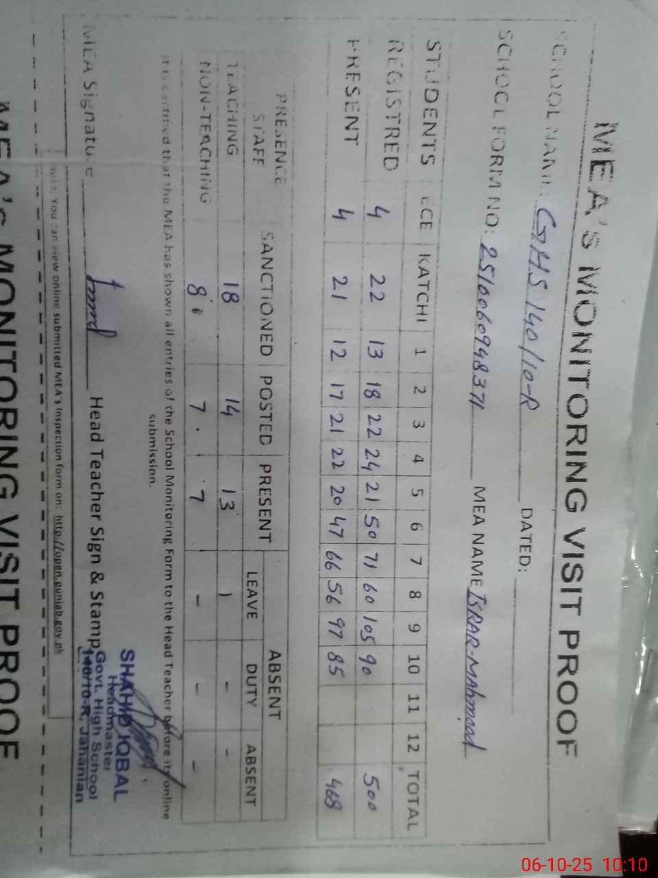 | Certified that this School was Inspected by the Undersigned MEA/DMO Today and the Information Stated Above is as Per Record. | |||||