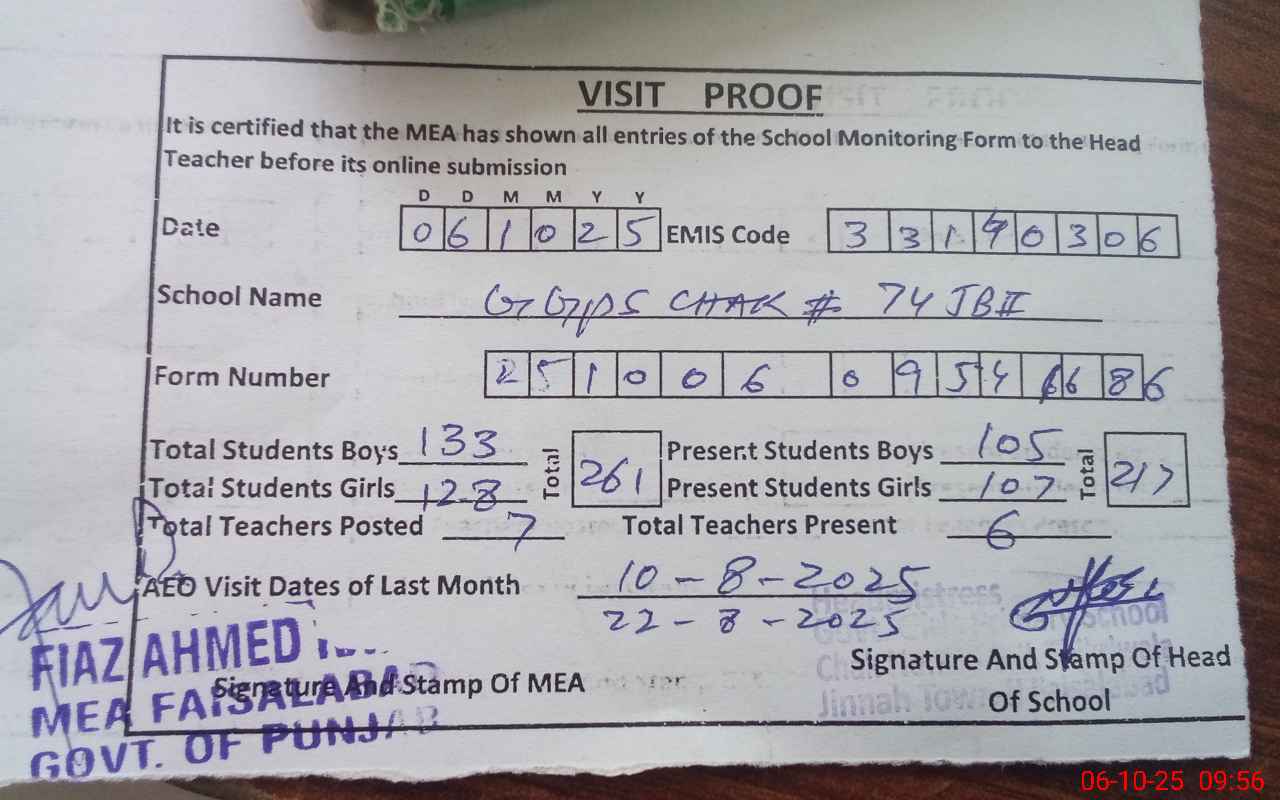 | EMIS Code: 33140306 | Name of School: GGPS CHAK NO 74 JB II | |||