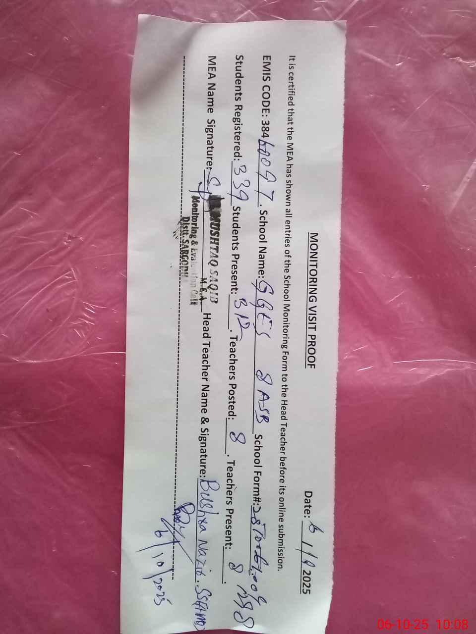 | Certified that this School was Inspected by the Undersigned MEA/DMO Today and the Information Stated Above is as Per Record. | |||||