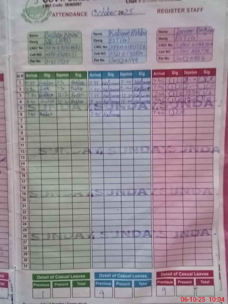 | CNIC | Full Name | Designation | R/C | Absence during last cal. month |