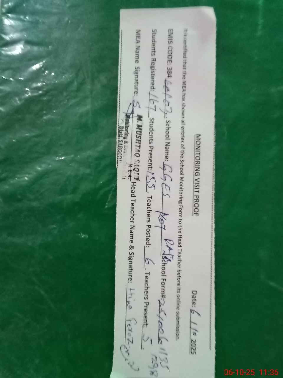 | Attendance Register | Head Teacher | MEA with School | Visit Proof |
