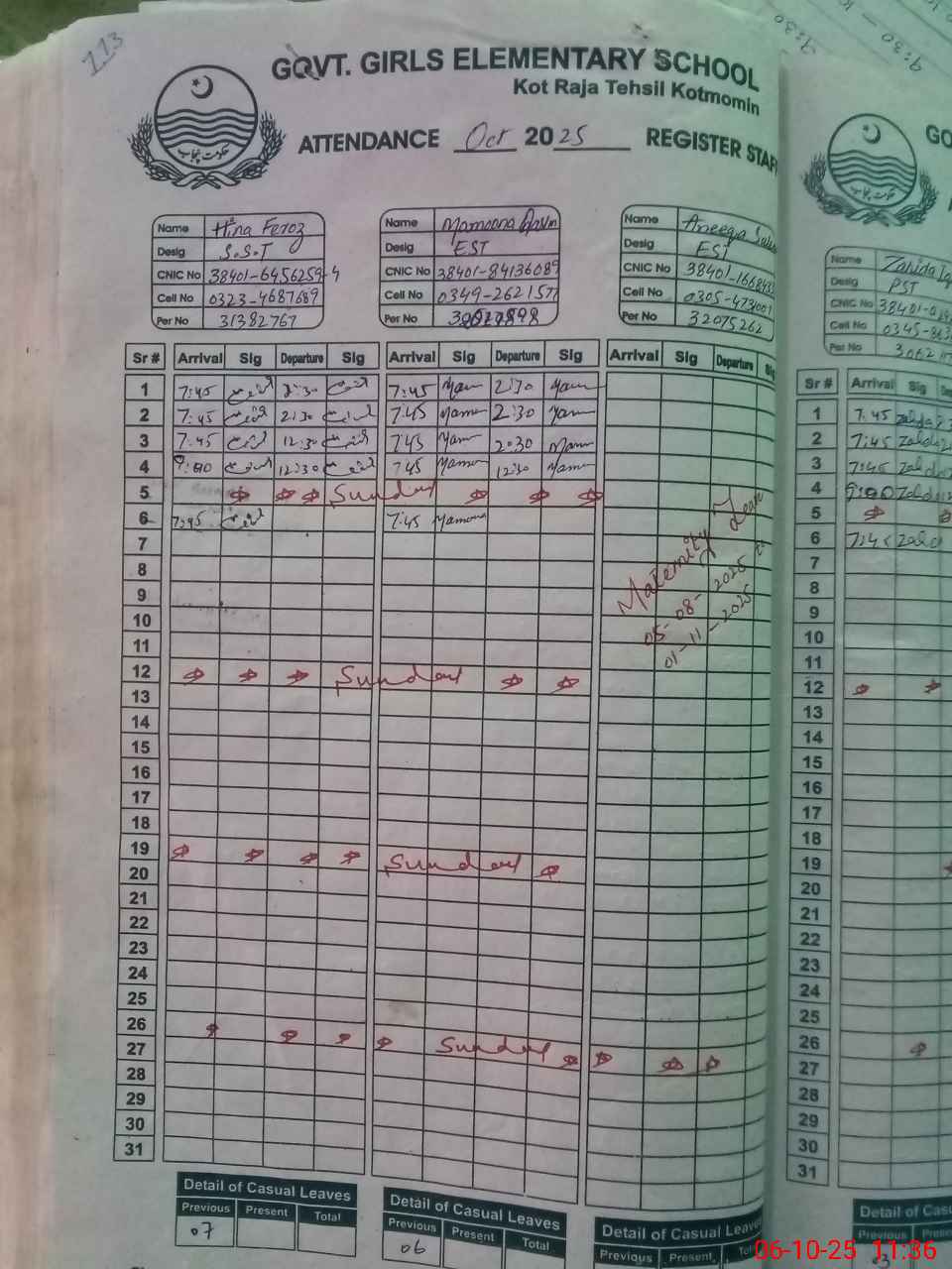 | CNIC | Full Name | Designation | R/C | Absence during last cal. month |