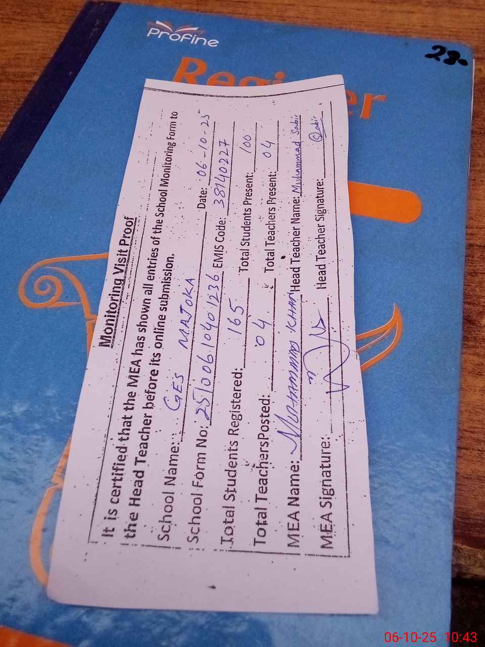 | Attendance Register | Head Teacher | MEA with School | Visit Proof |