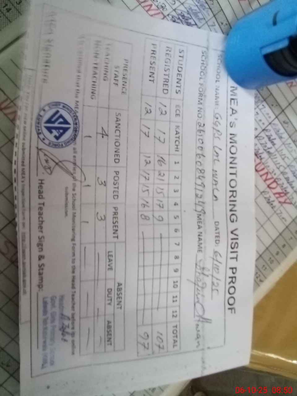 | Attendance Register | Head Teacher | MEA with School | Visit Proof |