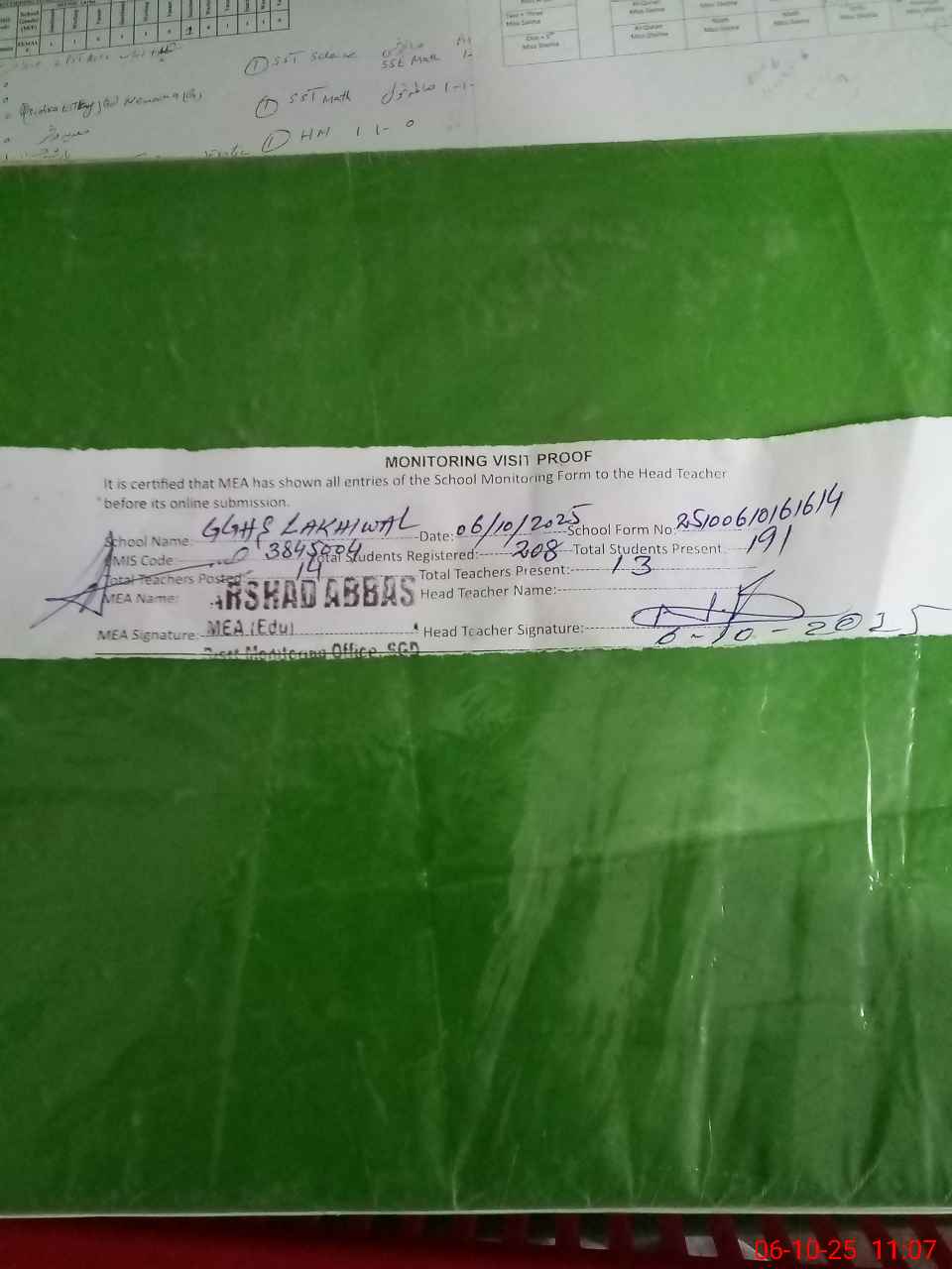 | Certified that this School was Inspected by the Undersigned MEA/DMO Today and the Information Stated Above is as Per Record. | |||||