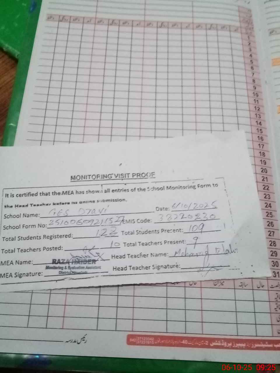 | Monitoring Date: 06-10-2025 | Start Time: 06-10-2025 08:36 AM | End Time: 06-10-2025 09:30 AM | Name of MEA: RA**** HA**** | |