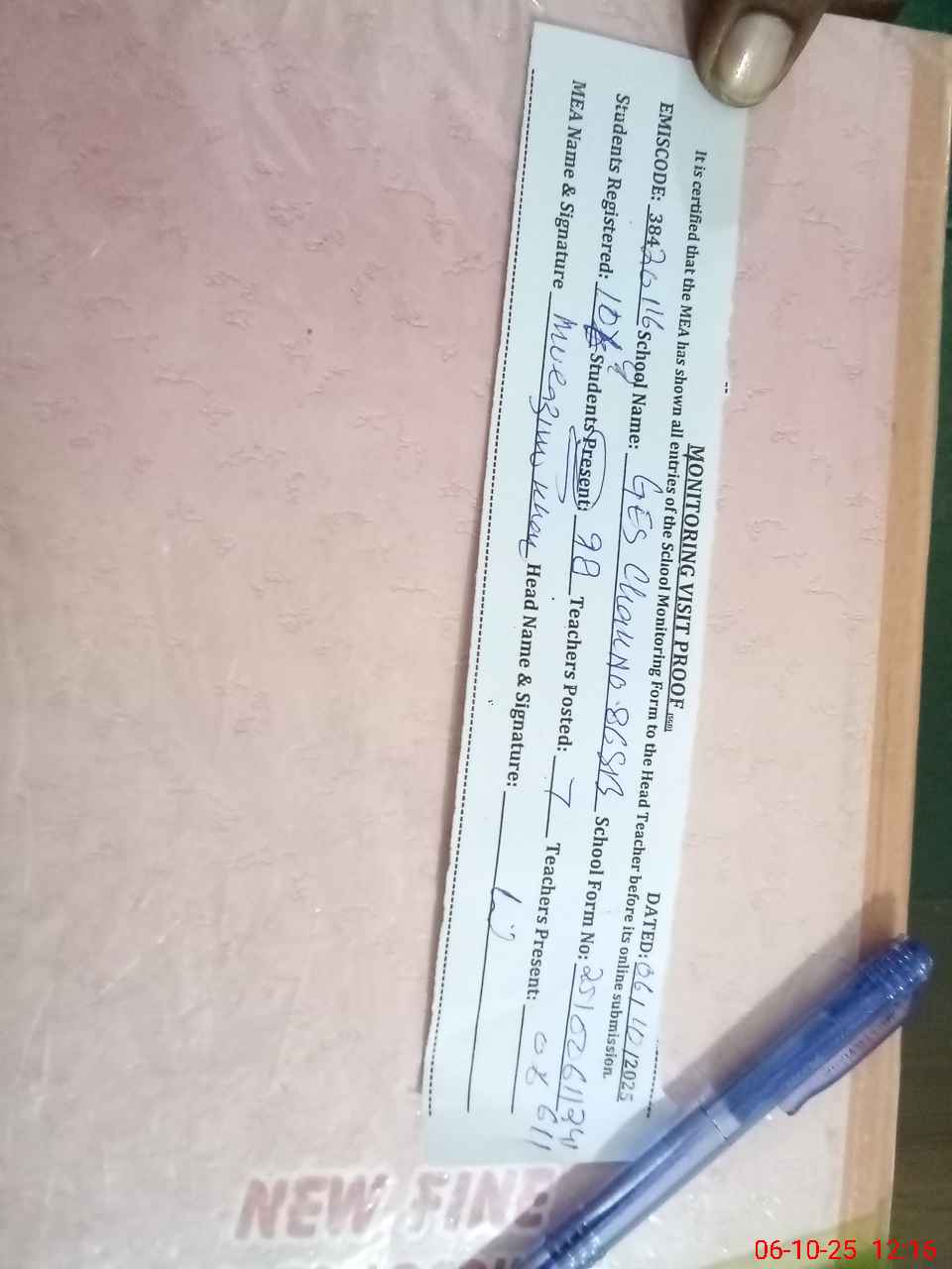 | Certified that this School was Inspected by the Undersigned MEA/DMO Today and the Information Stated Above is as Per Record. | |||||