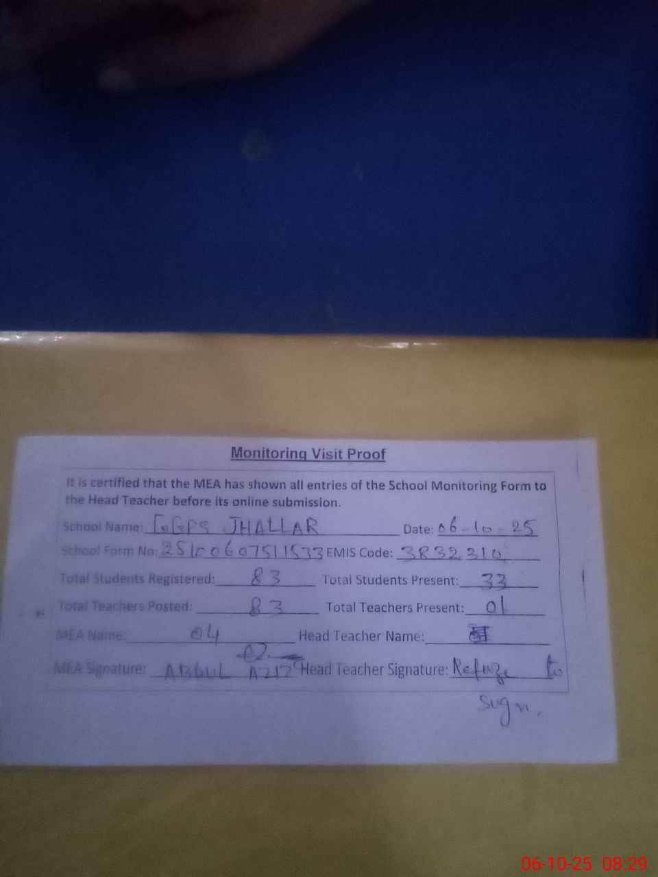| EMIS Code: 38310344 | Name of School: GGPS JHALLAR | |||