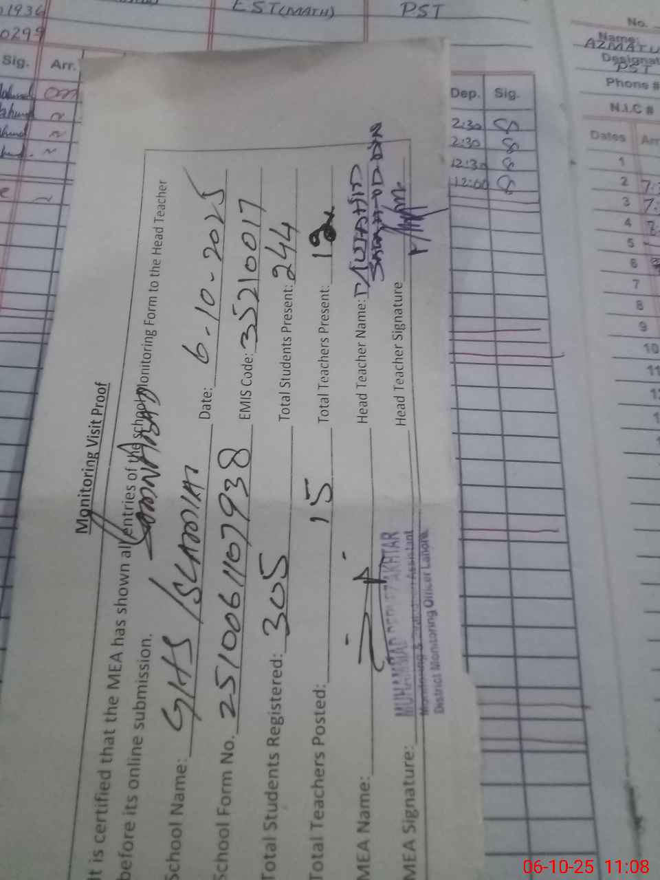| Monitoring Date: 06-10-2025 | Start Time: 06-10-2025 10:01 AM | End Time: 06-10-2025 11:09 AM | Name of MEA: M.**** AK**** | |
