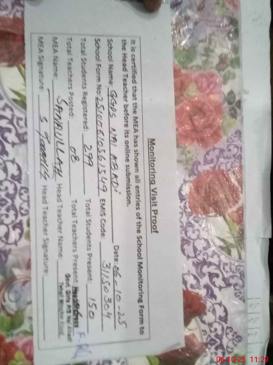 | Certified that this School was Inspected by the Undersigned MEA/DMO Today and the Information Stated Above is as Per Record. | |||||