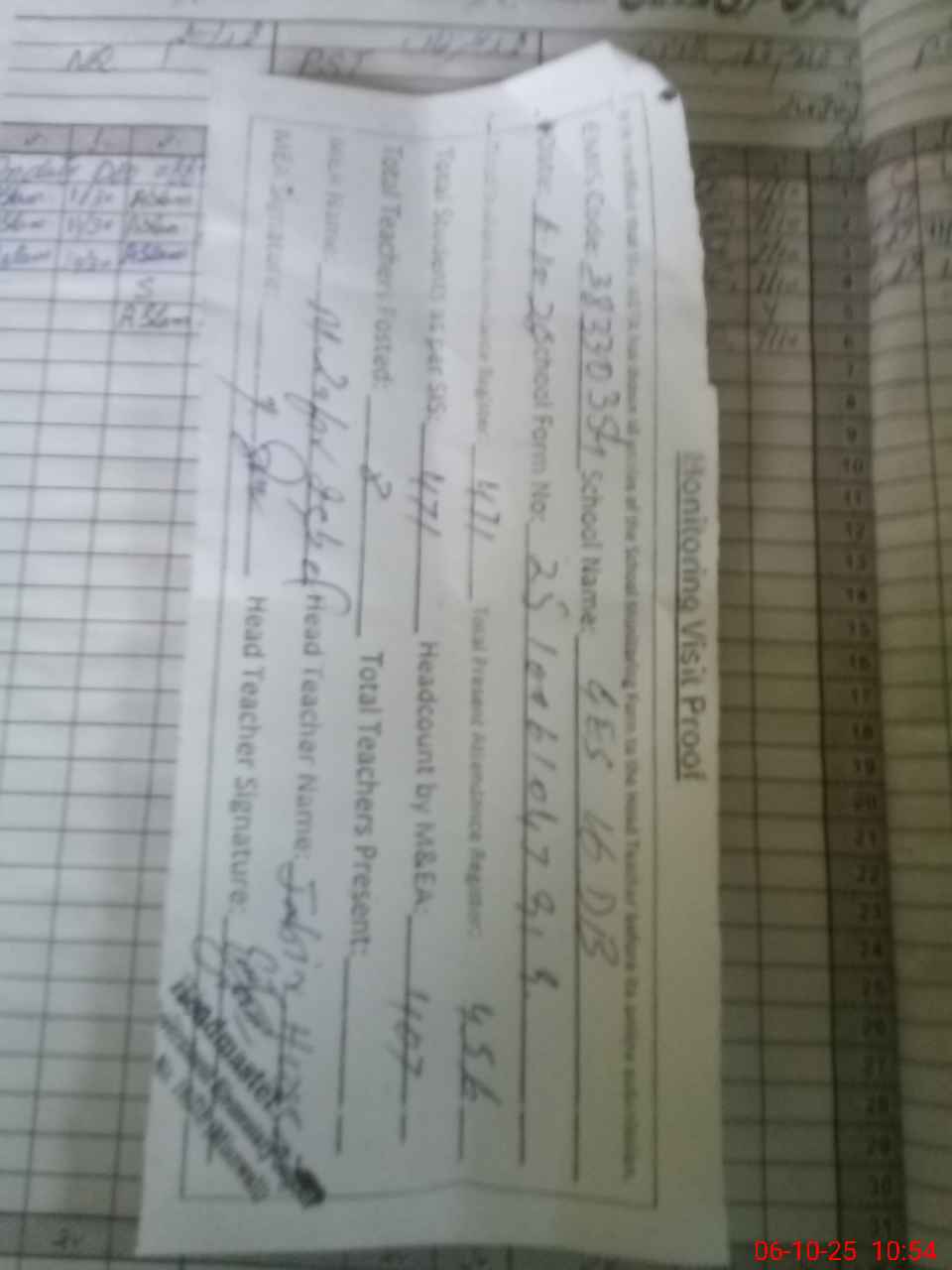 | Attendance Register | Head Teacher | MEA with School | Visit Proof |