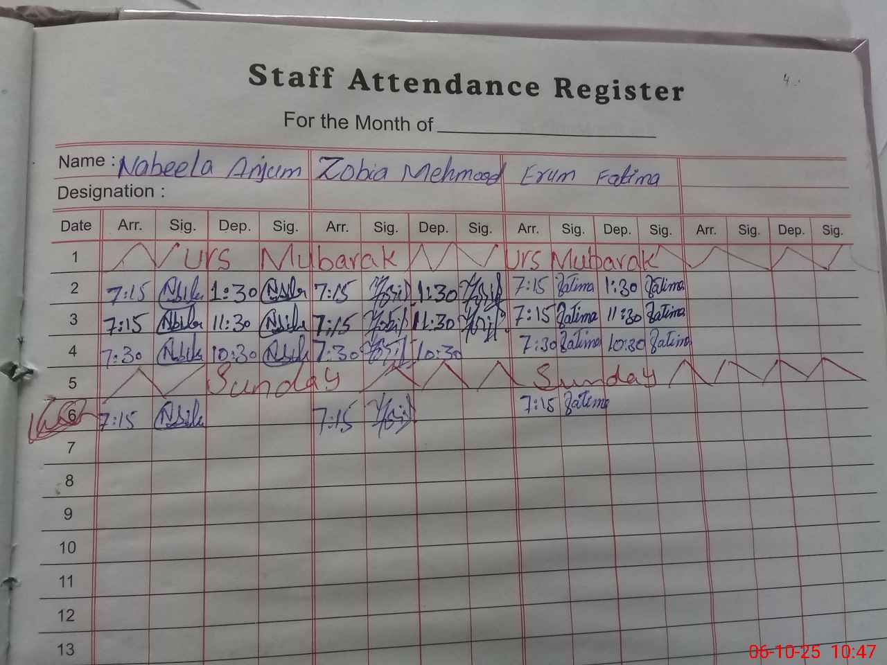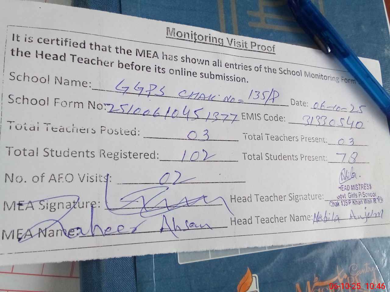 | Monitoring Date: 06-10-2025 | Start Time: 06-10-2025 09:58 AM | End Time: 06-10-2025 10:55 AM | Name of MEA: Za**** Ah**** | |