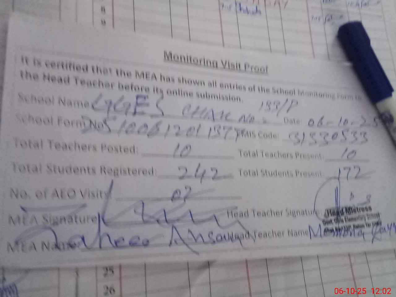 | Attendance Register | Head Teacher | MEA with School | Visit Proof |