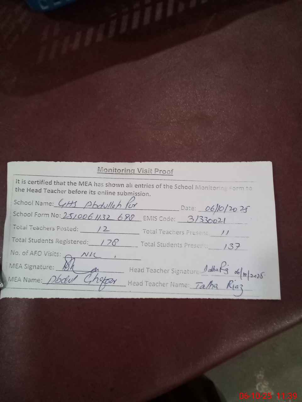 | Attendance Register | Head Teacher | MEA with School | Visit Proof |
