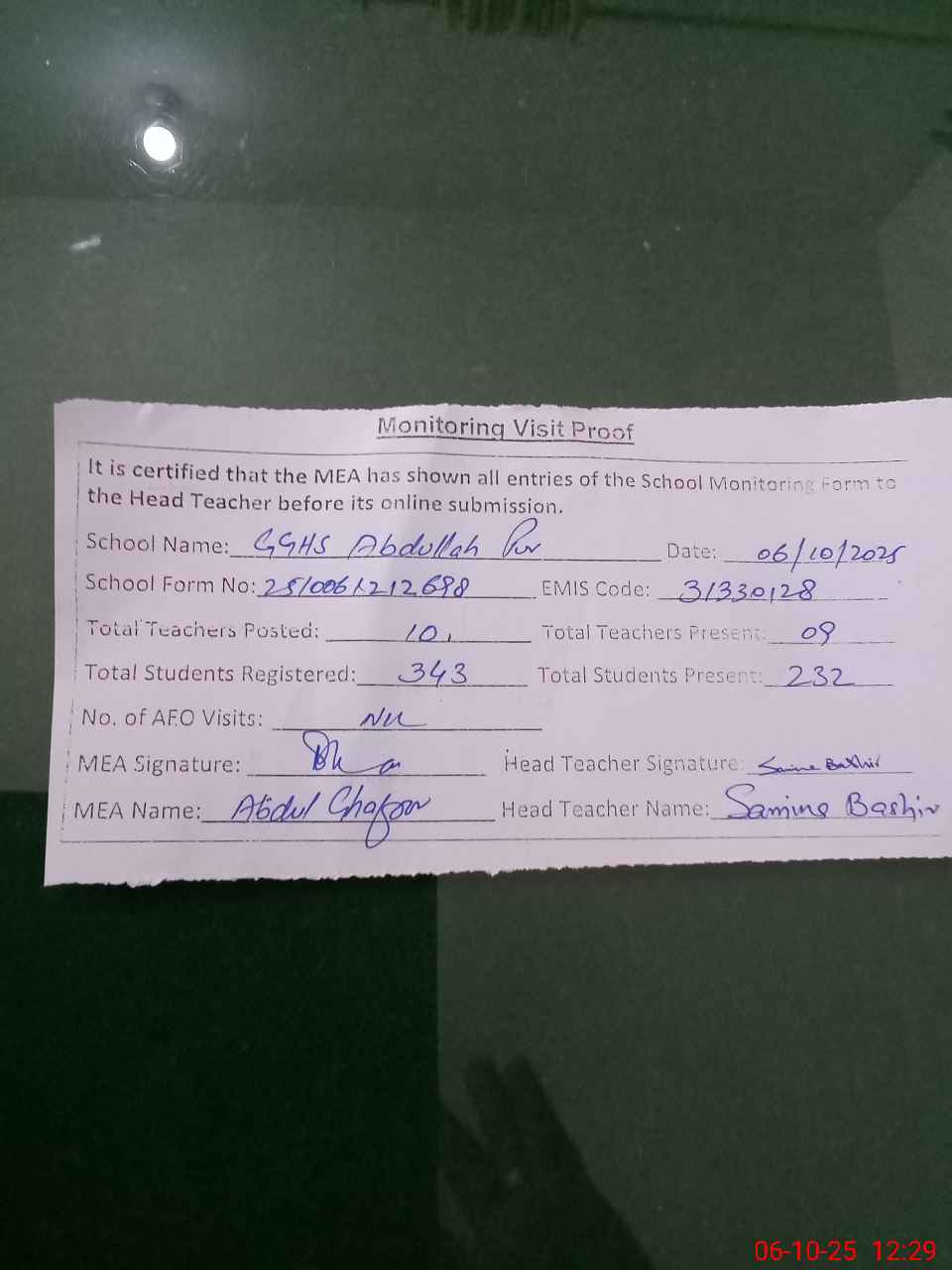 | Attendance Register | Head Teacher | MEA with School | Visit Proof |