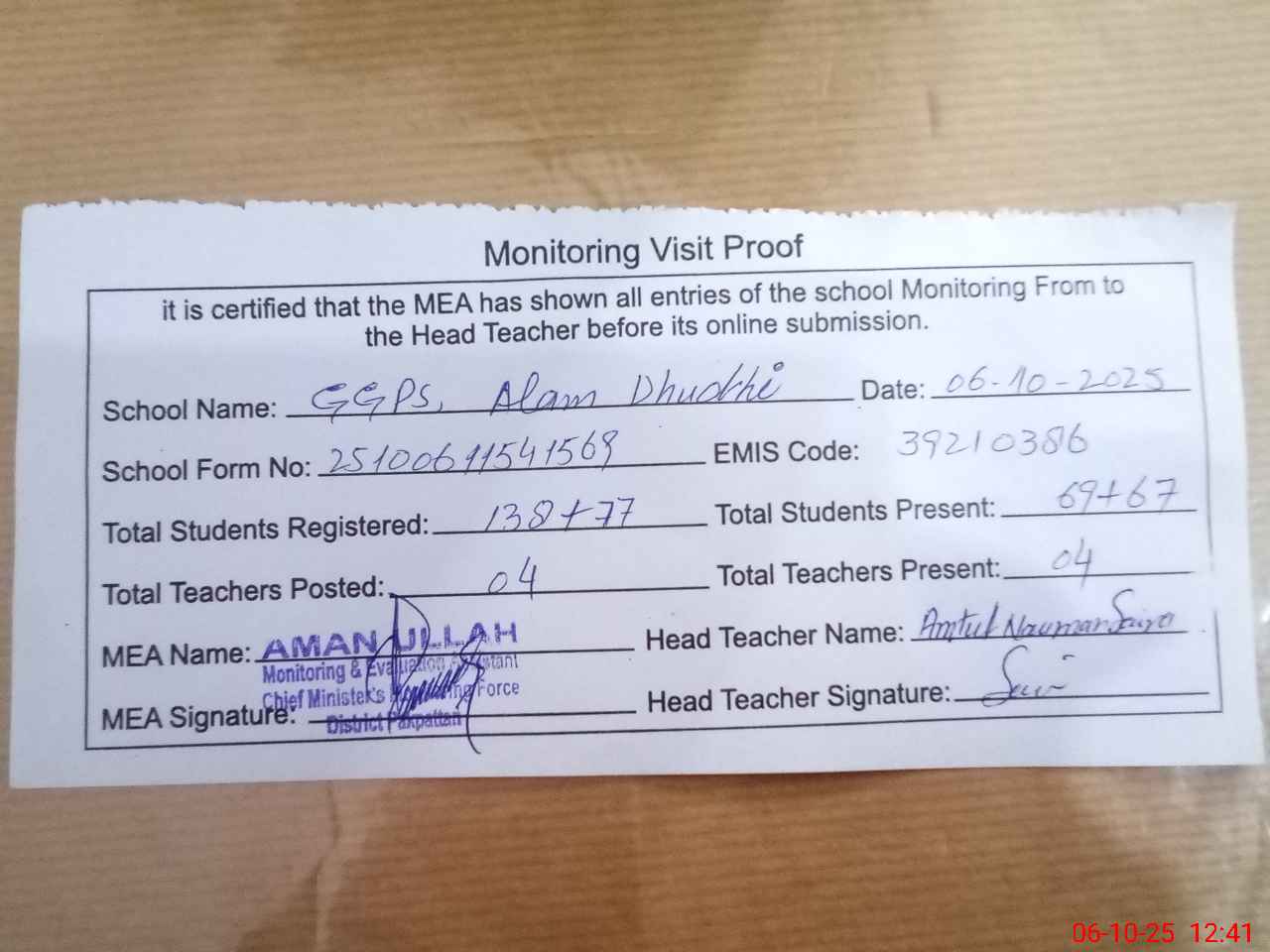 | EMIS Code: 39210386 | Name of School: GGPS ALAM DUHDI | |||