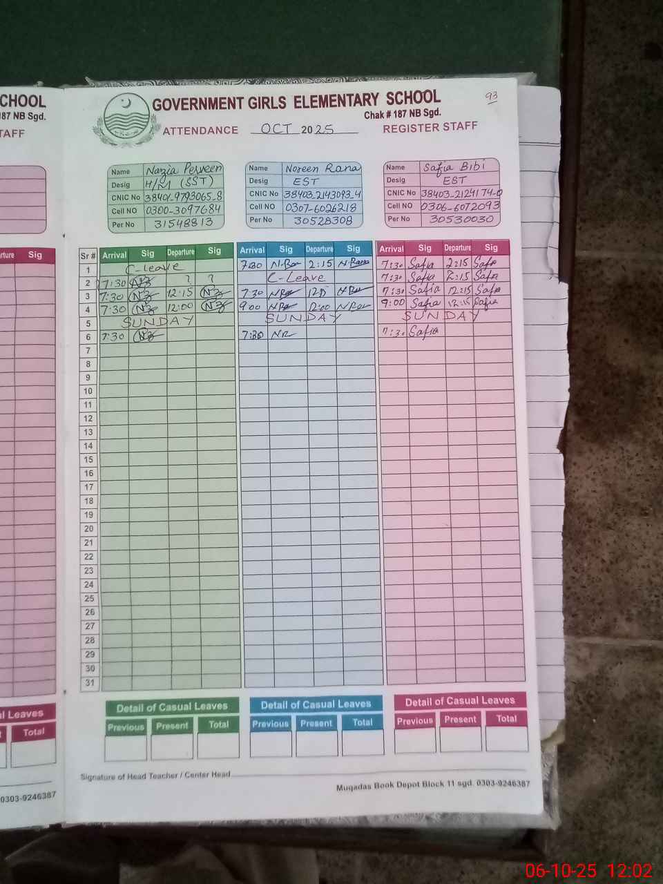 | CNIC | Full Name | Designation | R/C | Absence during last cal. month |