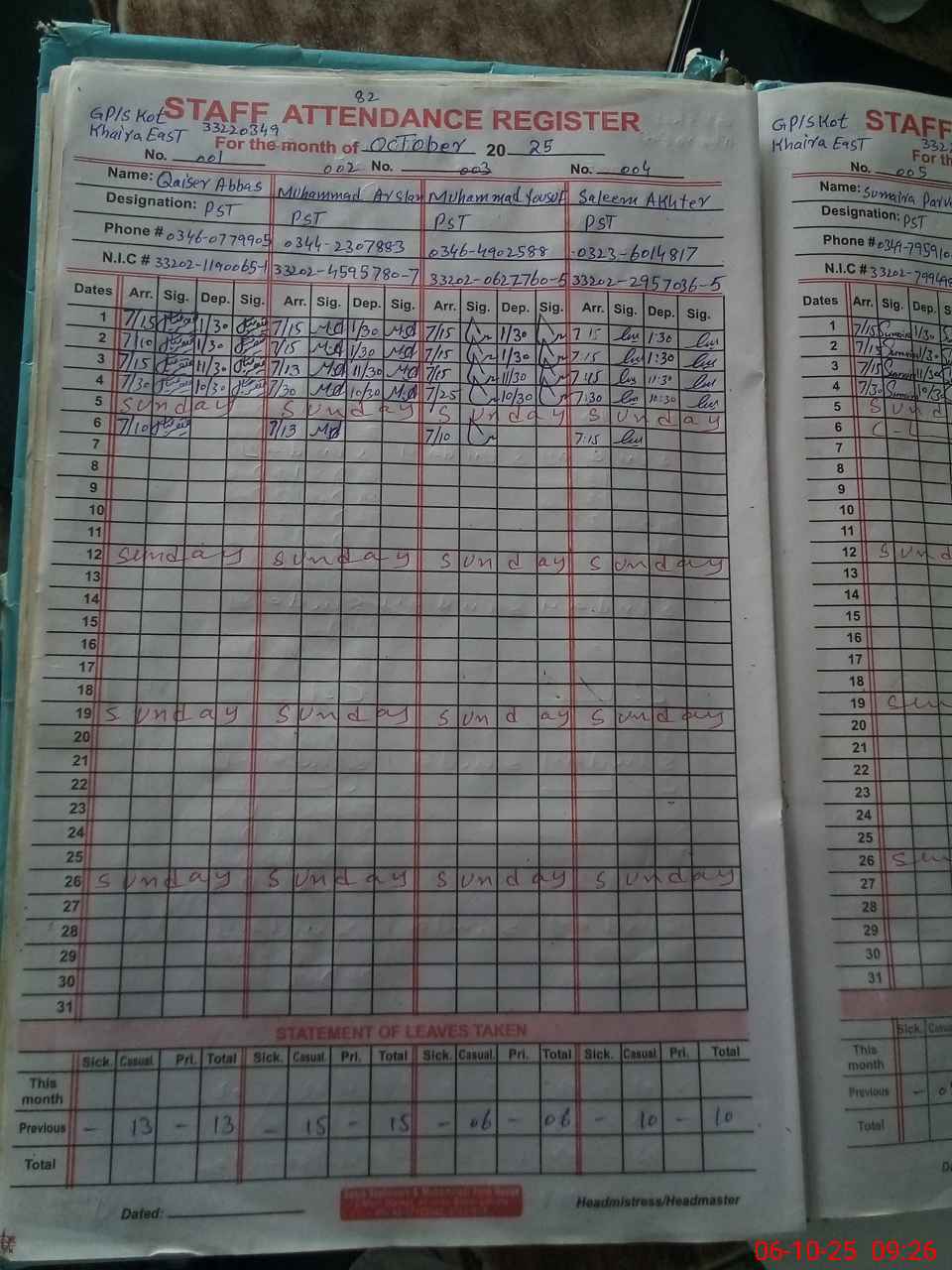 | CNIC | Full Name | Designation | R/C | Absence During Last Calender Month |