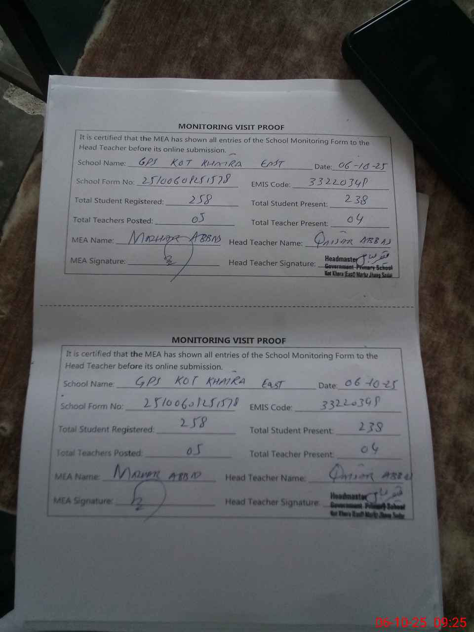| Attendance Register | Head Teacher | MEA with School | Visit Proof |