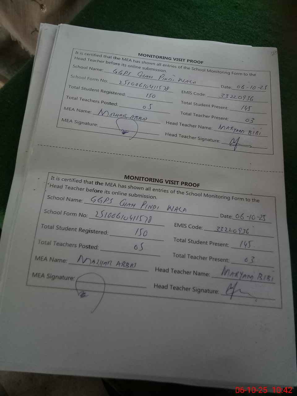 | Attendance Register | Head Teacher | MEA with School | Visit Proof |